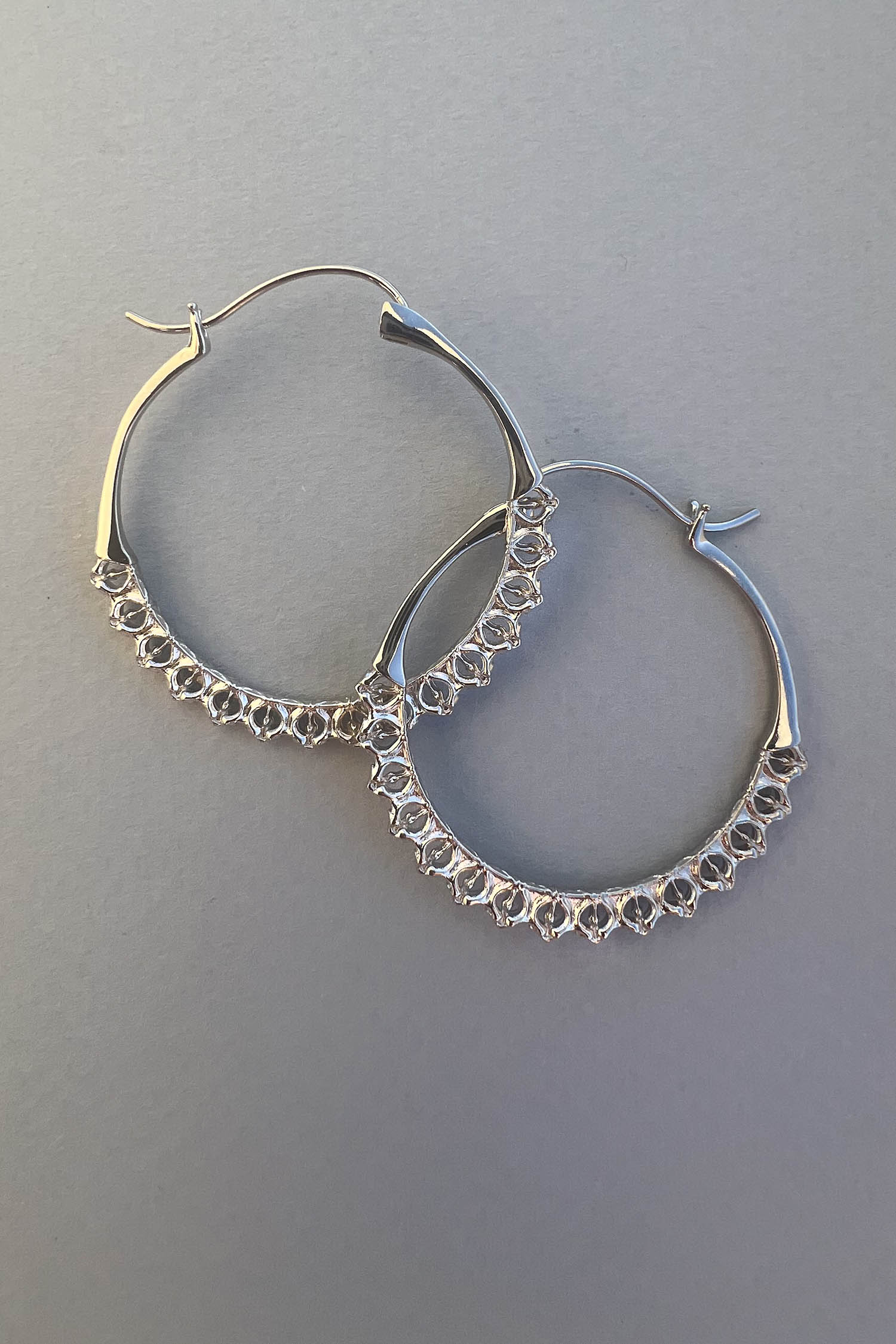 Evoke mystery and wonder with the Calla Hoops. These one-of-a-kind earrings feature a meticulously hand-sculpted motif along the lower half, designed to enthrall and captivate. Crafted for all-day comfort, these hoops offer the added surprise of being remarkably lightweight.