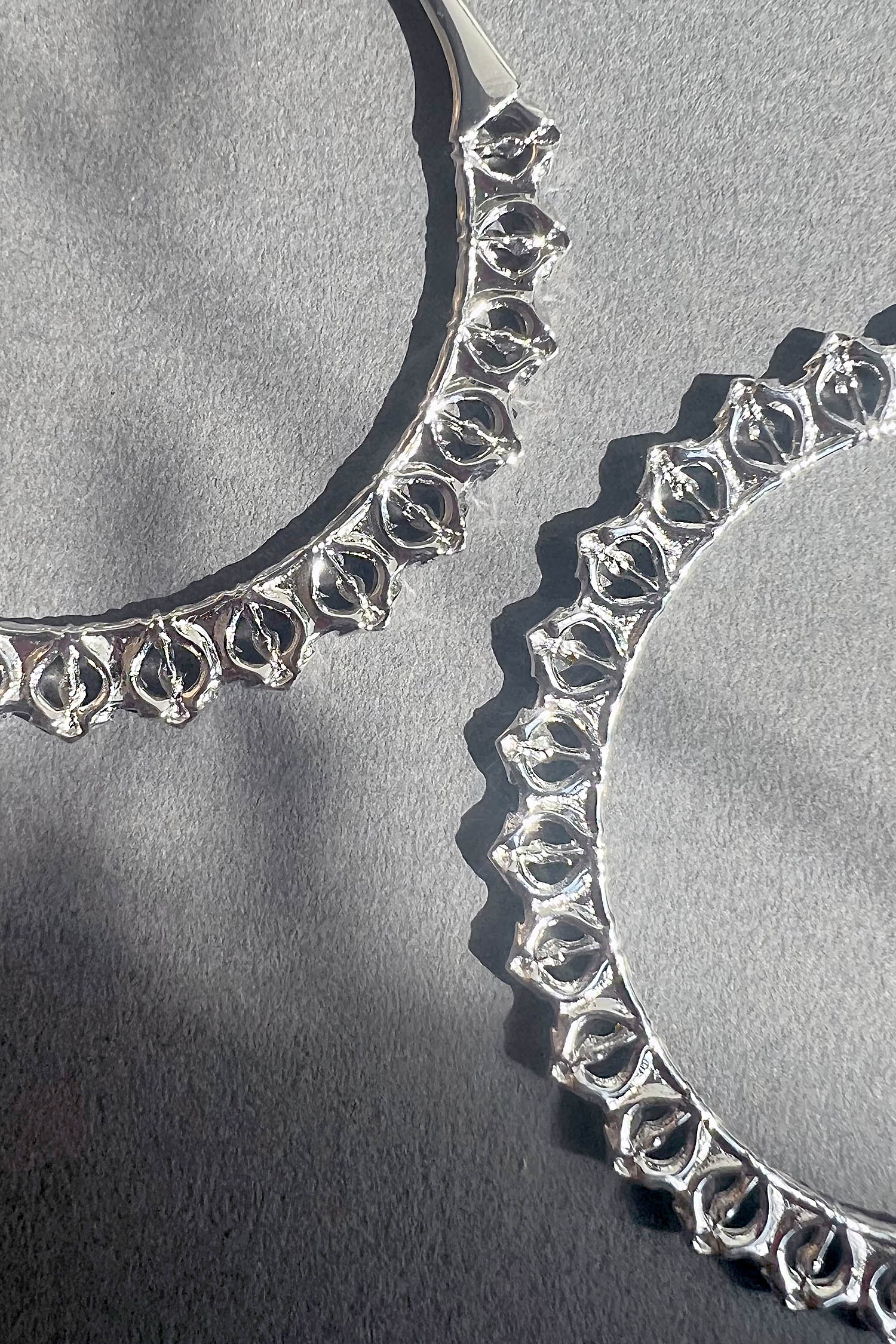 Evoke mystery and wonder with the Calla Hoops. These one-of-a-kind earrings feature a meticulously hand-sculpted motif along the lower half, designed to enthrall and captivate. Crafted for all-day comfort, these hoops offer the added surprise of being remarkably lightweight.