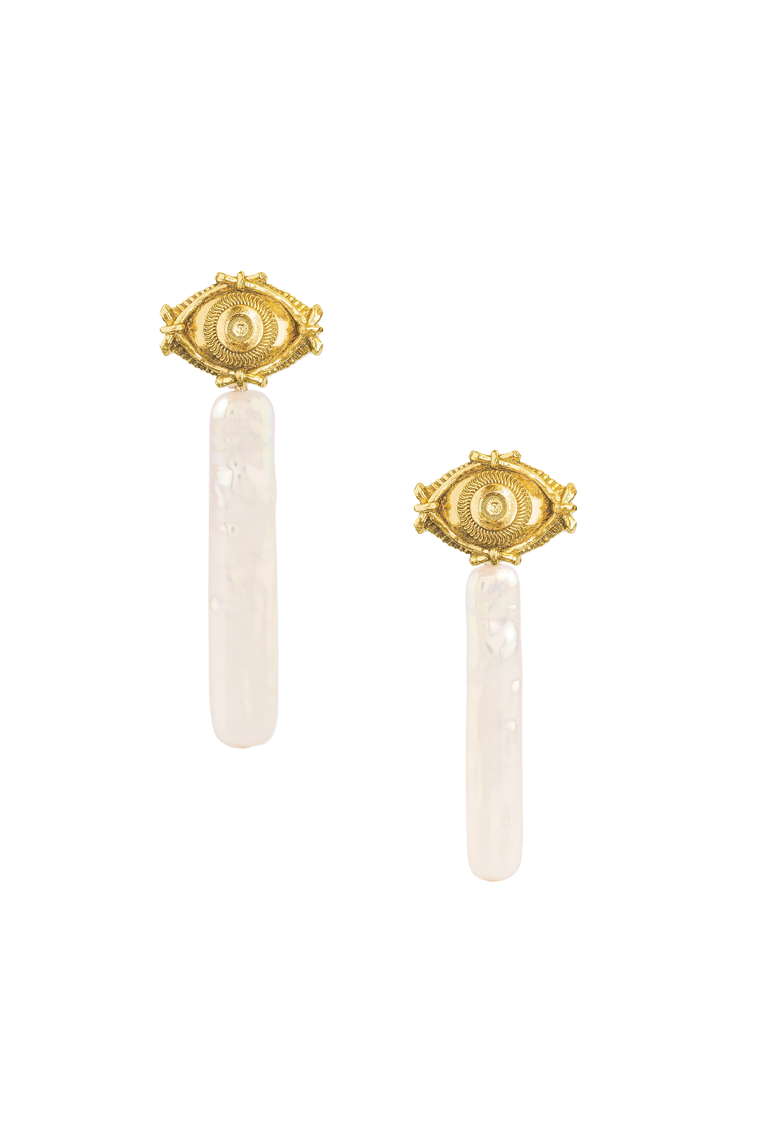 Sharp vision meets fluid design in the Akilos Ear Jacket Studs. The eye-shaped stud symbolizes intuition and clarity, while a sleek rectangular freshwater pearl drops from behind the earlobe for a layered, floating effect.