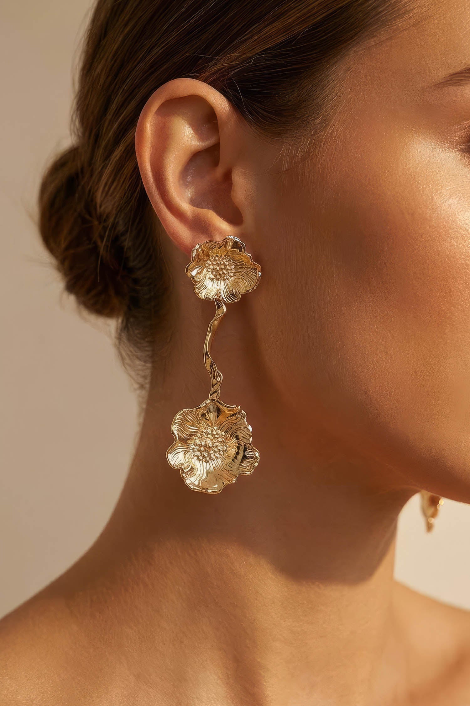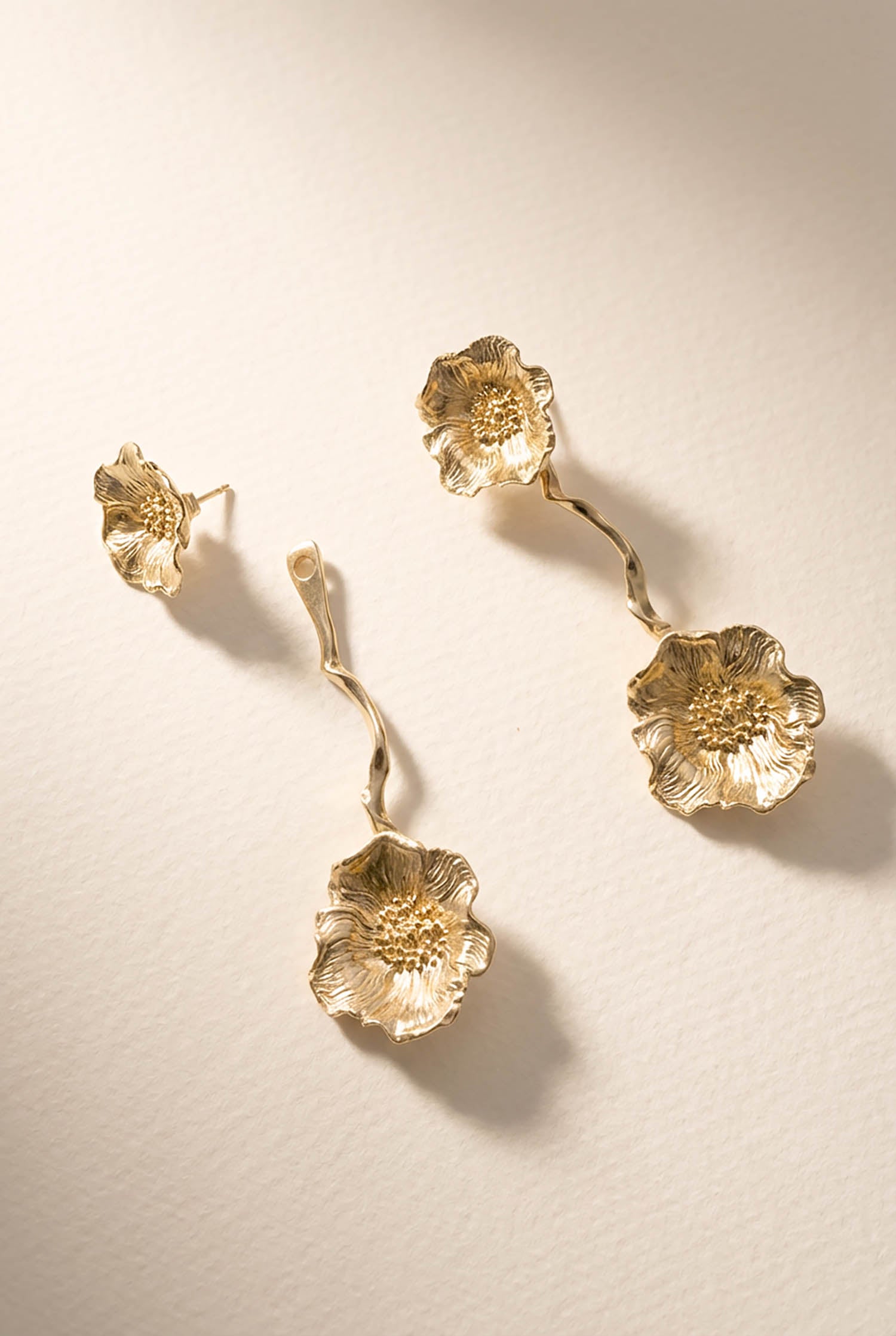 This modular design can be worn multiple ways—on its own as a floral stud, or with the sculptural extension for added movement and impact. Lightweight and adaptable, it shifts easily between subtle and statement.